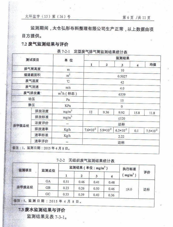 表中數(shù)據(jù):經(jīng)靜電凈化處理后,排氣筒非甲烷總烴(染整油煙)排放濃度分別為:12mg/m3、9.36mg/m3、9.92mg/m3、15.8mg/m3 均值為11.8mg/m3 ,低于浙江省標準限值。